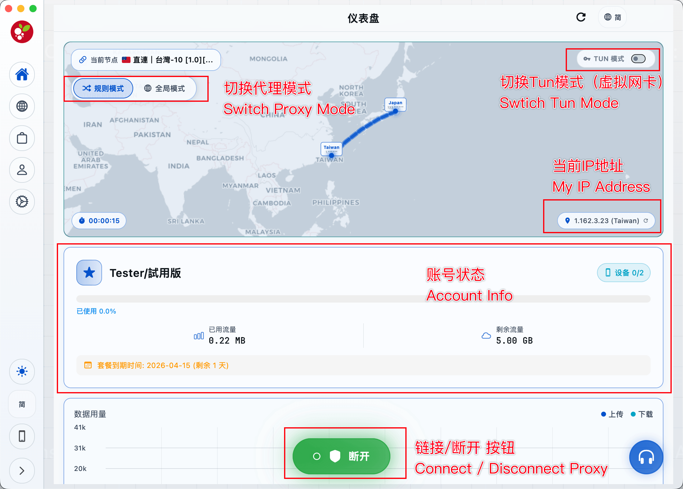 点击主界面 [ TUN 模式 ] 开关打开即可打开或关闭tun模式。